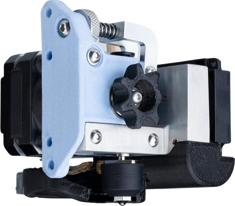 Seitlich des Kühlblocks wurden Kühlrippen platziert, mit dem Ziel, den Filamentweg so kurz wie möglich zu gestalten. Dieser verkürzte Filamentweg sorgt dafür, dass der Extruder schneller und präziser reagiert und es nicht zum Knicken kommt. Die scharfen Zähne der beiden Antriebsräder greifen das Filament besonders fest von beiden Seiten, wodurch dieses nicht nur geschmeidig, sondern auch gleichmäßig in das Hotend geschoben wird.