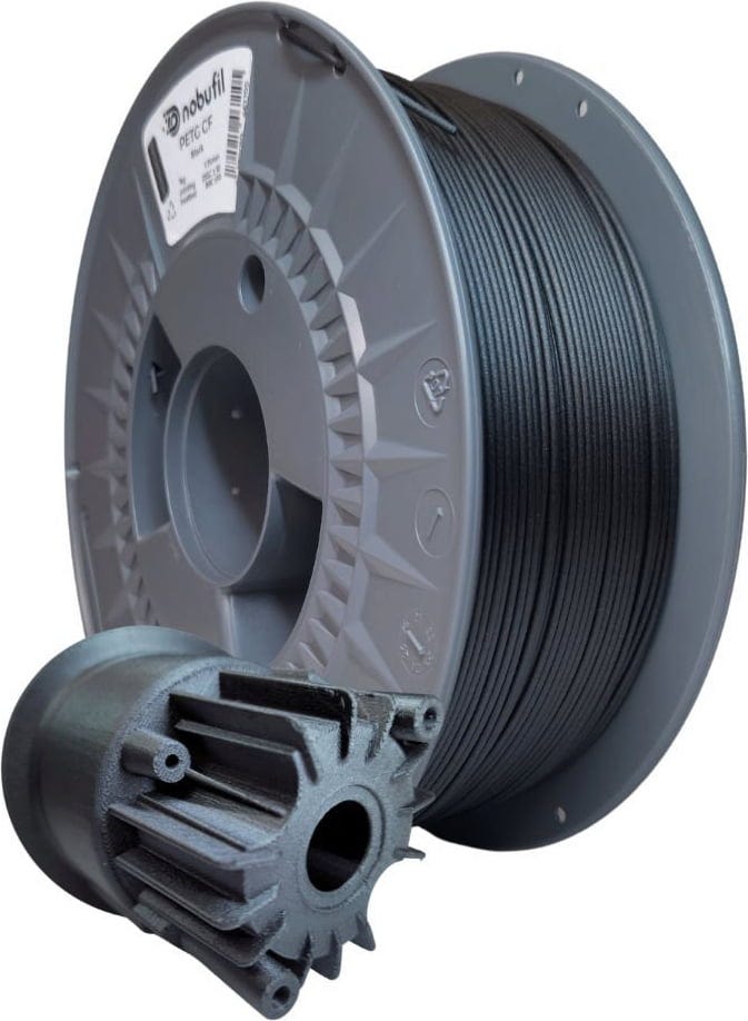 Das PETG CF von Nobufil ist ein kohlenstofffaserverstärktes Material aus recycelten Industrieabfällen. Das Material weist eine hervorragende Steifigkeit und Festigkeit auf, gleichzeitig ist es gegen Chemikalien, Feuchtigkeit sowie Temperaturen von bis zu 90 °C beständig.