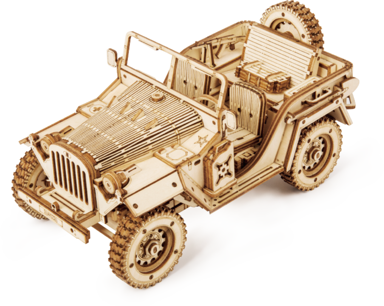 Clever gesteckt, ohne Kleber: Das Army Field Car besteht aus lasergeschnittenem Sperrholz, das sauber verarbeitet, glatt und angenehm in der Hand liegt. Alle Teile sind vorgefertigt und kommen komplett ohne Klebstoff aus. Stattdessen sorgen raffinierte Steckverbindungen und ineinandergreifende Mechanismen für Stabilität und eine überraschend clevere Konstruktion.