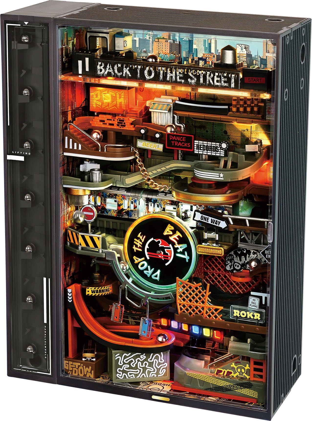 - Anzeigemodus: Die Murmeln kommen zur Ruhe, der Lift stoppt – aber die Neonlichter reagieren weiterhin auf Geräusche. Perfekt als leuchtendes Deko-Highlight mit Street-Attitude.