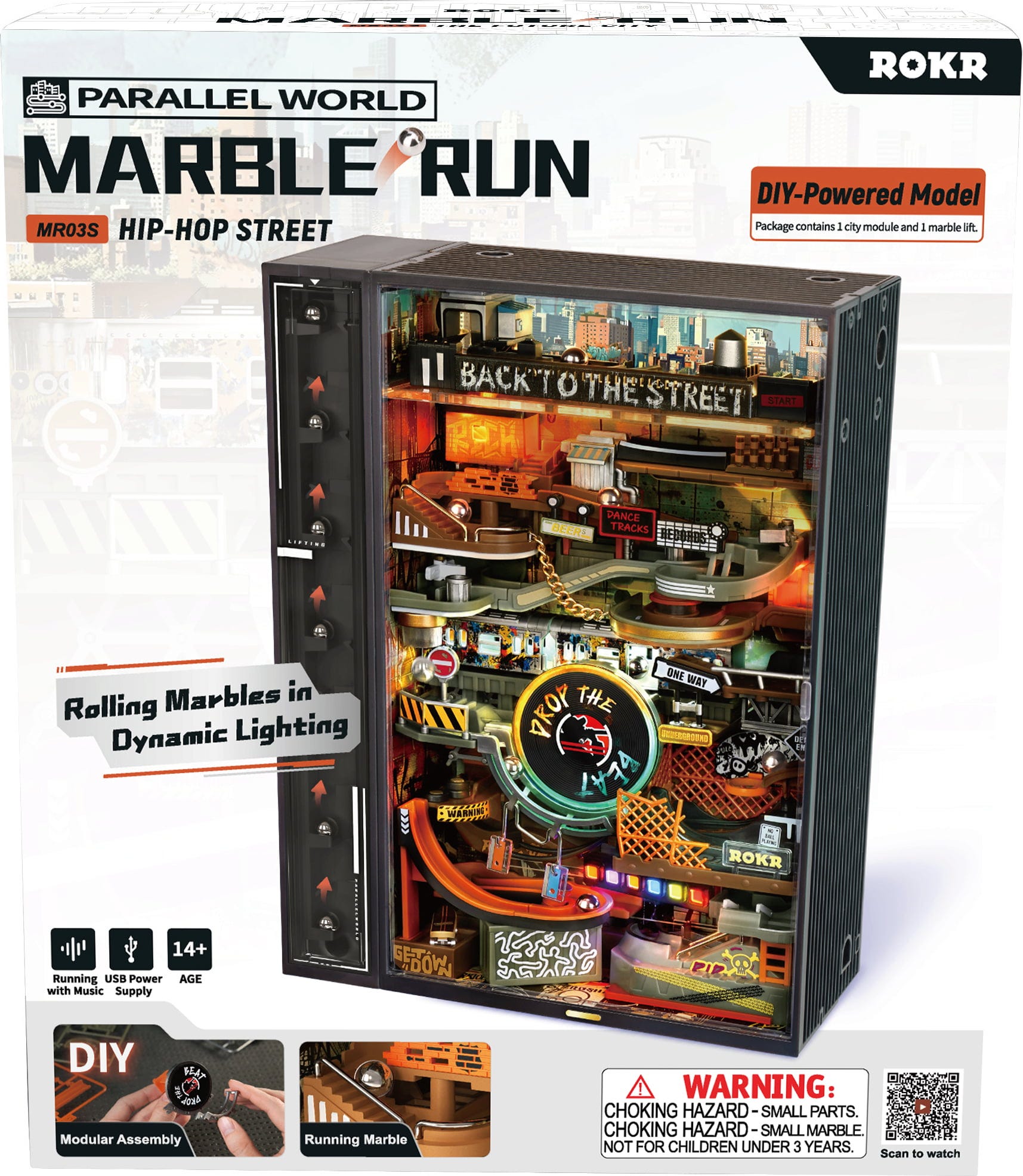 Willkommen auf der ROKR Hip-Hop Street! Hier rollen Murmeln nicht einfach durch Bahnen – sie bewegen sich im Rhythmus der Stadt. Graffiti an den Wänden, goldene Ketten im Design, eine drehende Schallplatte im Zentrum und ein Skatepark, der aussieht, als hätte jemand ihn gerade frisch mit Neonfarbe besprüht. Dieses 3D Holzpuzzle ist eine urbane Spielwiese, inspiriert von Street Culture, Musik und Bewegung.