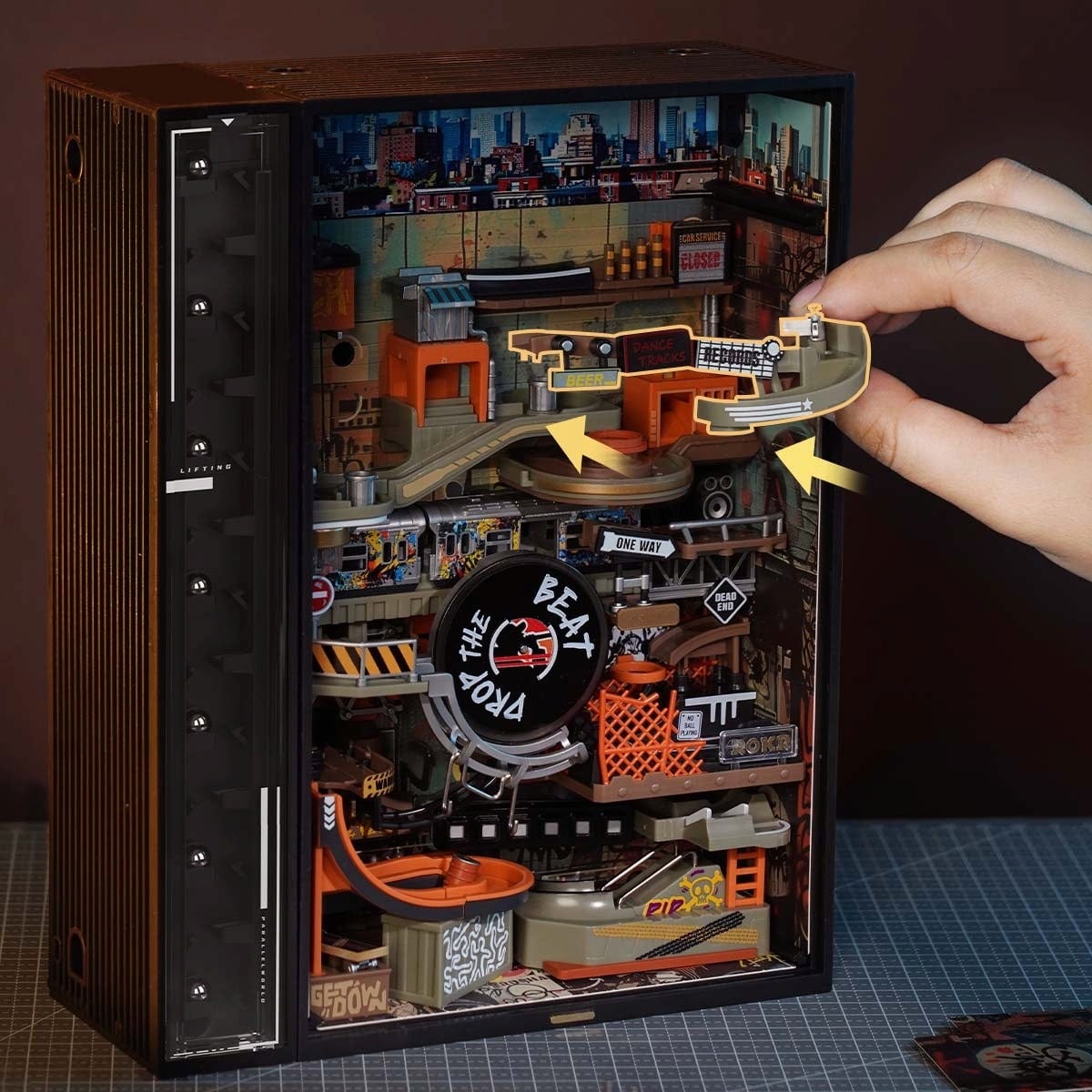 Die Stadt hört zu: Das Herzstück der Hip-Hop Street ist ihre geräuschreaktive Beleuchtung. Sechs integrierte LED-Lichtkästen reagieren auf Umgebungsgeräusche und erzeugen fast 100 zufällige Lichtsequenzen. Musik, Stimmen oder Beats bringen die Neonlichter zum Pulsieren – jede Umgebung macht das Modell ein bisschen anders. Stillstehen? Gibt es nicht.