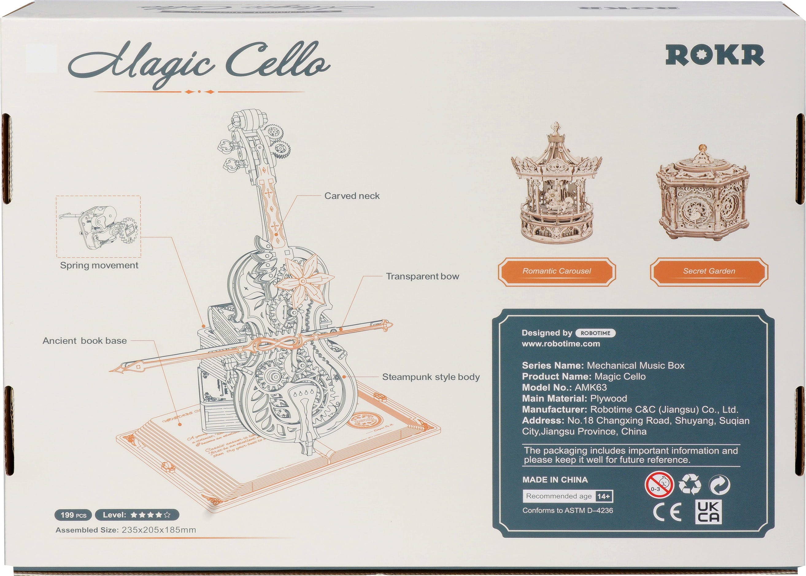 Das ROKR Magic Cello ist ein mechanisches 3D Holzpuzzle, das Musik, Bewegung und Fantasie miteinander verbindet. Aus filigranen Holzteilen entsteht ein aufrechtes Cello im Vintage-Stil, gebettet auf einem offenen Grimoire und gestützt von einem Stapel magischer Bücher. Alles wirkt, als wäre es einem verzauberten Musikzimmer entsprungen.