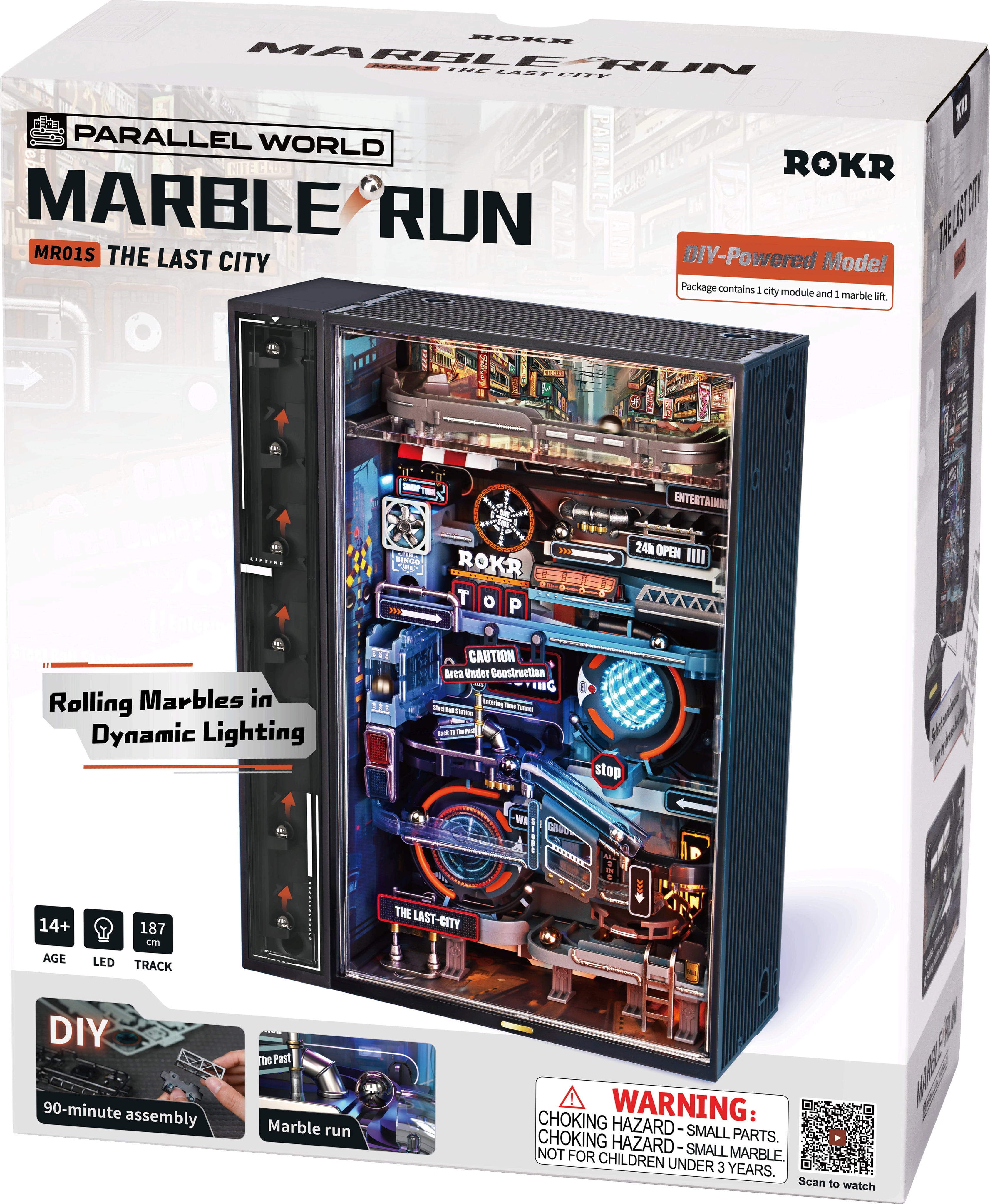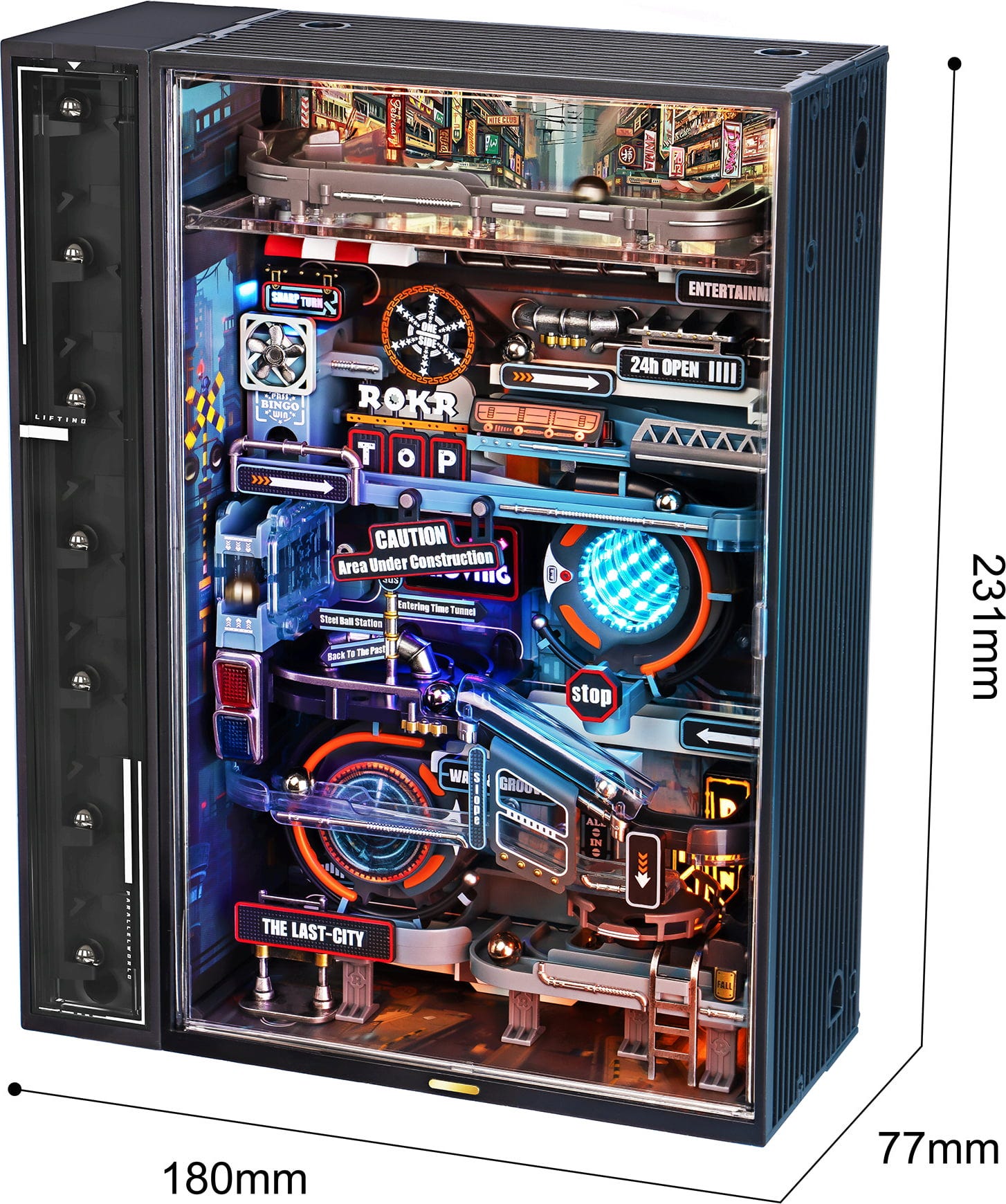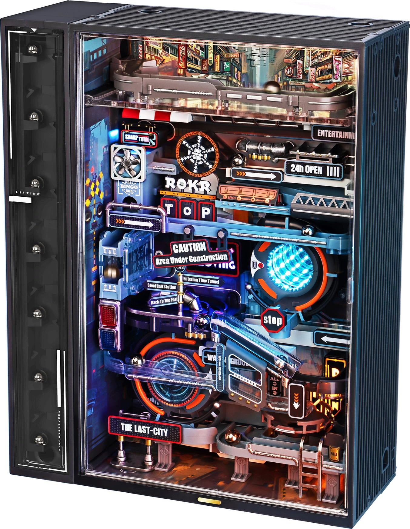 Beim Aufbau entsteht kein simples Modell, sondern eine ganze Stadtlandschaft. Hochhäuser, Lichtkanäle und technische Module formen ein geschlossenes System, durch das Murmeln auf einer 187 cm langen Strecke durch futuristische Szenen gleiten. Jede Ebene fühlt sich an wie ein neues Level.