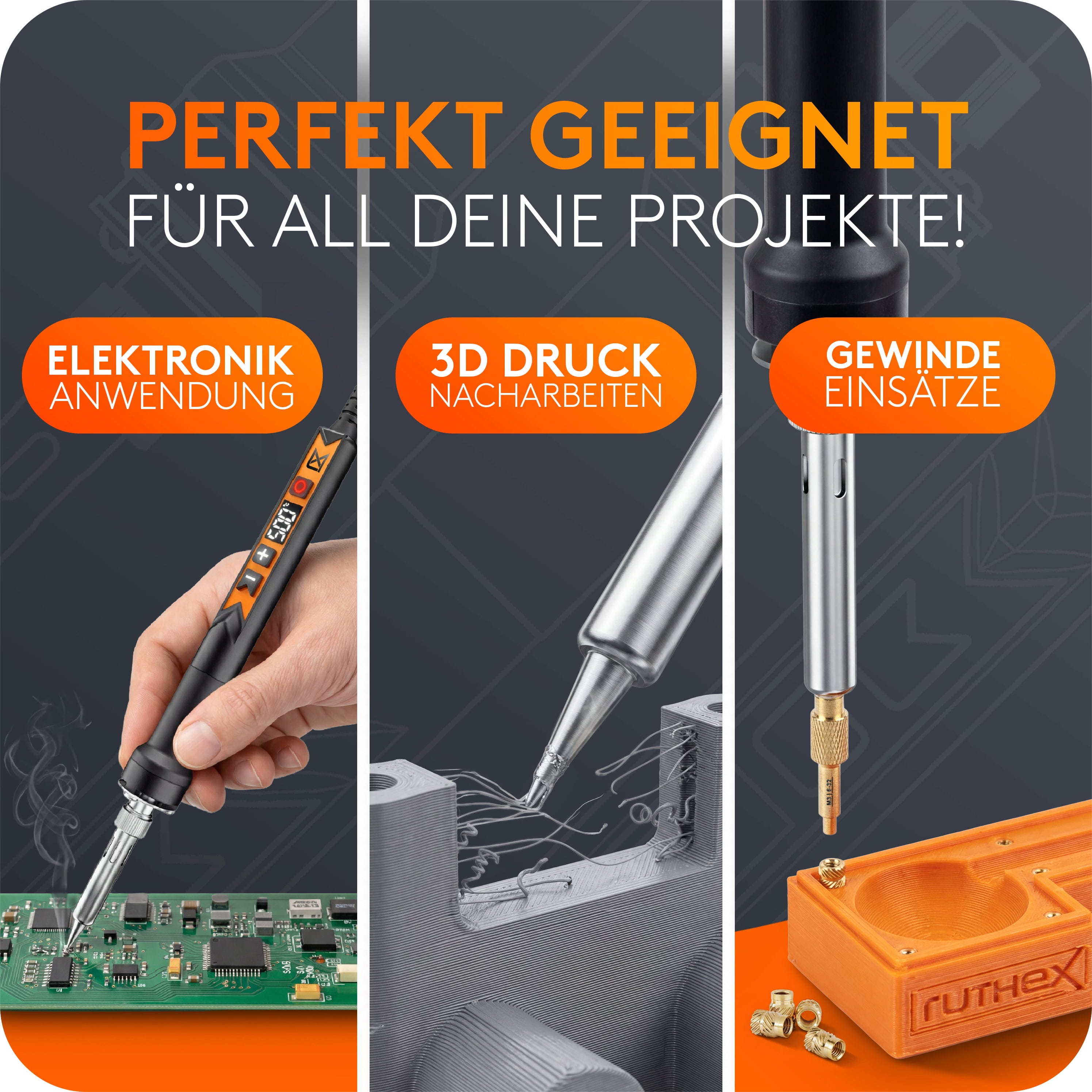 Der ruthex 900M Lötkolben ist ein leistungsstarkes Präzisionswerkzeug für saubere, kontrollierte Lötarbeiten im Bereich Elektronik, 3D-Druck und Feinmechanik. Durch seine durchdachte Konstruktion und moderne Temperaturregelung eignet er sich sowohl für ambitionierte Anwender als auch für den professionellen Einsatz.