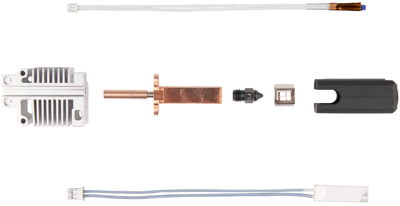 Das Hotend ermöglicht den Druck mit diversen Materialien, unter anderem TPU, PLA, PETG, ABS, PC, ASA, Nylon, Kohlefaser, Holz, u. v. m.